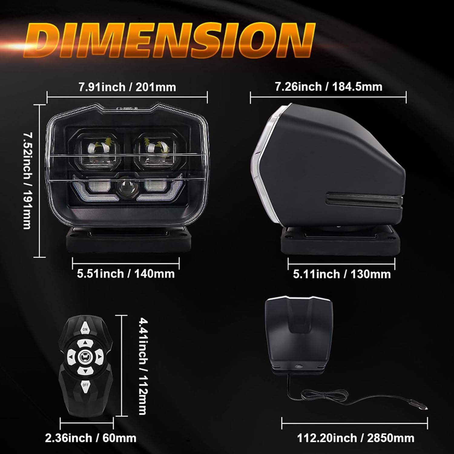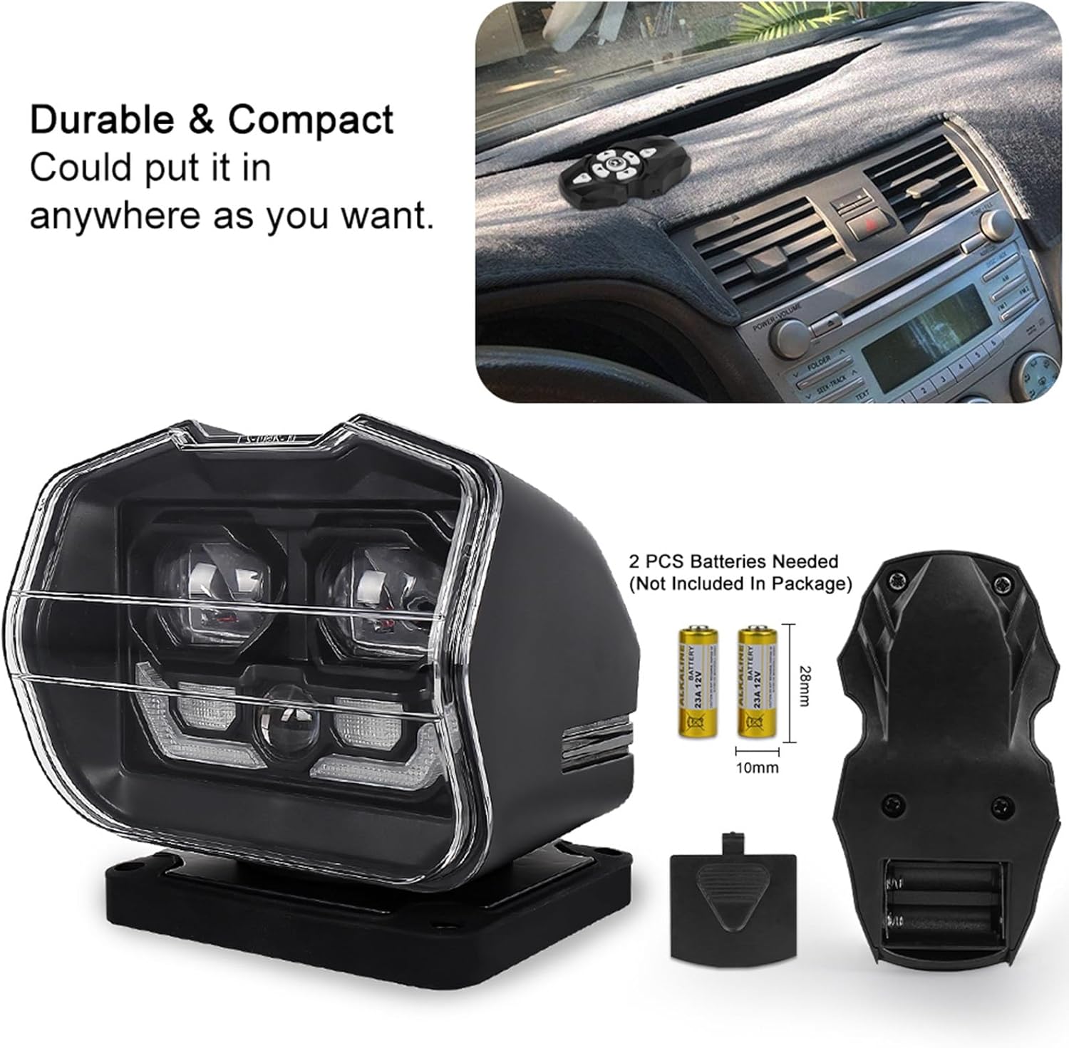 Application:Available in the auxiliary lamp for SUV, boat, home security, farm, field protection, emergency lighting, garden, Car etc.New Upgrade: A rotatable wireless remote-controlled LED light possess about 22 degree vertical rotation range and 360 degree horizontal rotation range to achieve wider illumination range (Up and down together 45rotation, left and right 360rotation).Product name: car roof light50W Remote Controlled LED SearchlightLED power: 50WWorking voltage: 12V DCWaterproof grade: IP65Available colors: blackColor temperature: 6500KLuminous flux: 4500LMMaterial: alloy, plastic, etc.Optical beam: spotlightpacking list:Roof light*1Notice:1. Please be aware that there can be small variations in item size owing to human measurement. Please be considerate.2. Please note that because of variations in light and display settings, the color of the actual item may differ slightly. Thank you for your understanding and support.