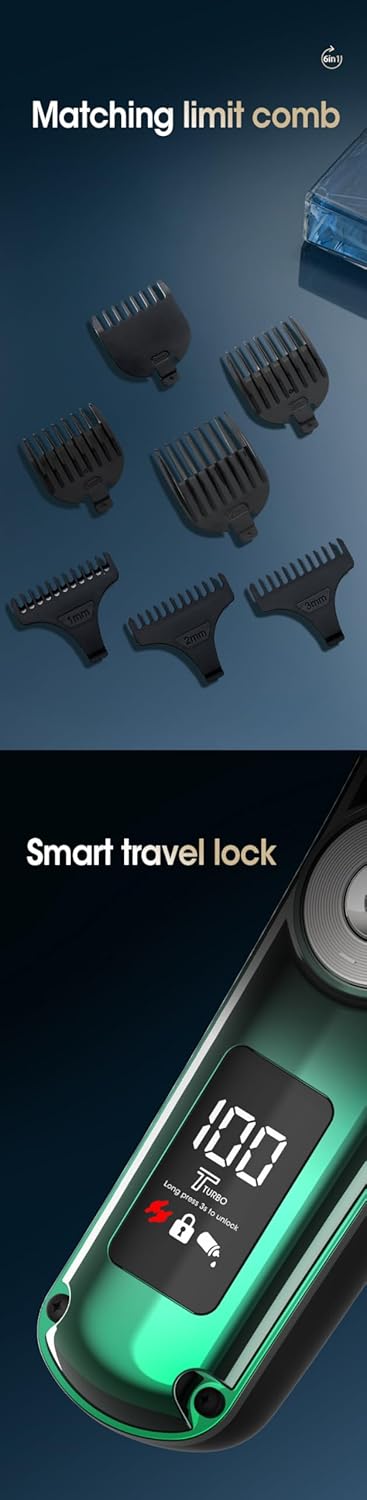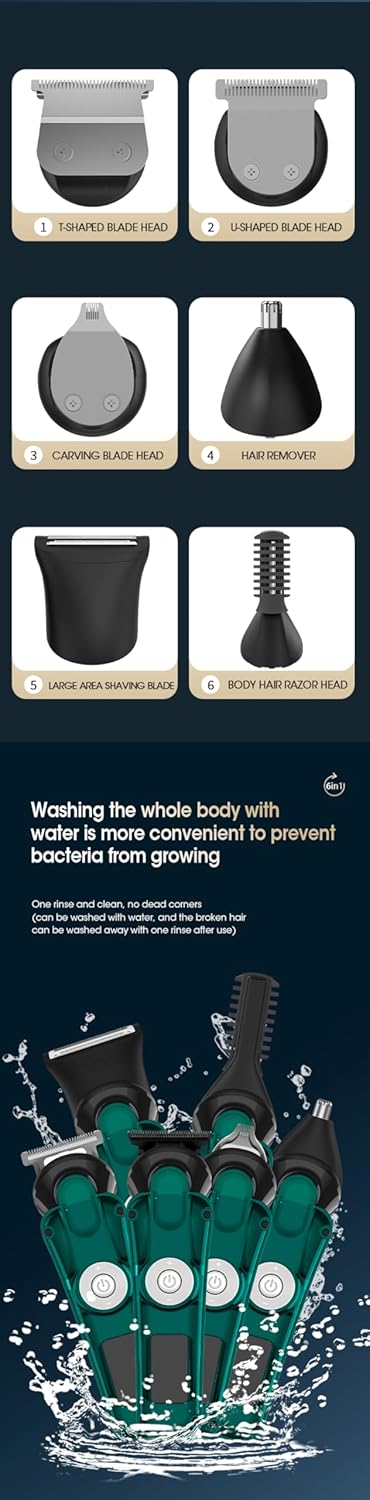 Transform your grooming routine with our comprehensive 6-in-1 Men's Multifunctional Professional Electric Grooming Kit. Tailored for the modern man who values efficiency and quality, this set combines an electric hair clipper, precision trimmer, nose hair clipper, and shaver into one sleek package, designed to handle all your grooming needs at home or on the go. Crafted with precision in mind, each tool features ultra-sharp stainless steel blades that deliver smooth, irritation-free cutting and shaving. Whether you're maintaining a precise beard line, trimming nose hairs, or achieving a clean shave, these tools ensure a close and comfortable experience every time. The cordless design provides the flexibility needed for unrestricted movement, powered by a rechargeable battery that supports extended operation on a single charge. Ideal for busy lifestyles, it’s perfect for use at home or while traveling. Designed for comfort and ease of use, the ergonomic handles offer secure grips that reduce hand fatigue during extended grooming sessions. This thoughtful design makes daily grooming tasks more manageable and enjoyable. Maintenance is simple with the included cleaning brush and oil, which help keep your tools in top condition. Plus, a convenient storage case is provided to keep all components neatly organized and protected when not in use. Upgrade your grooming game with this multifunctional kit and discover the convenience and quality of having all your grooming essentials in one place. Perfect for men who seek precision, durability, and versatility in their personal care routine.