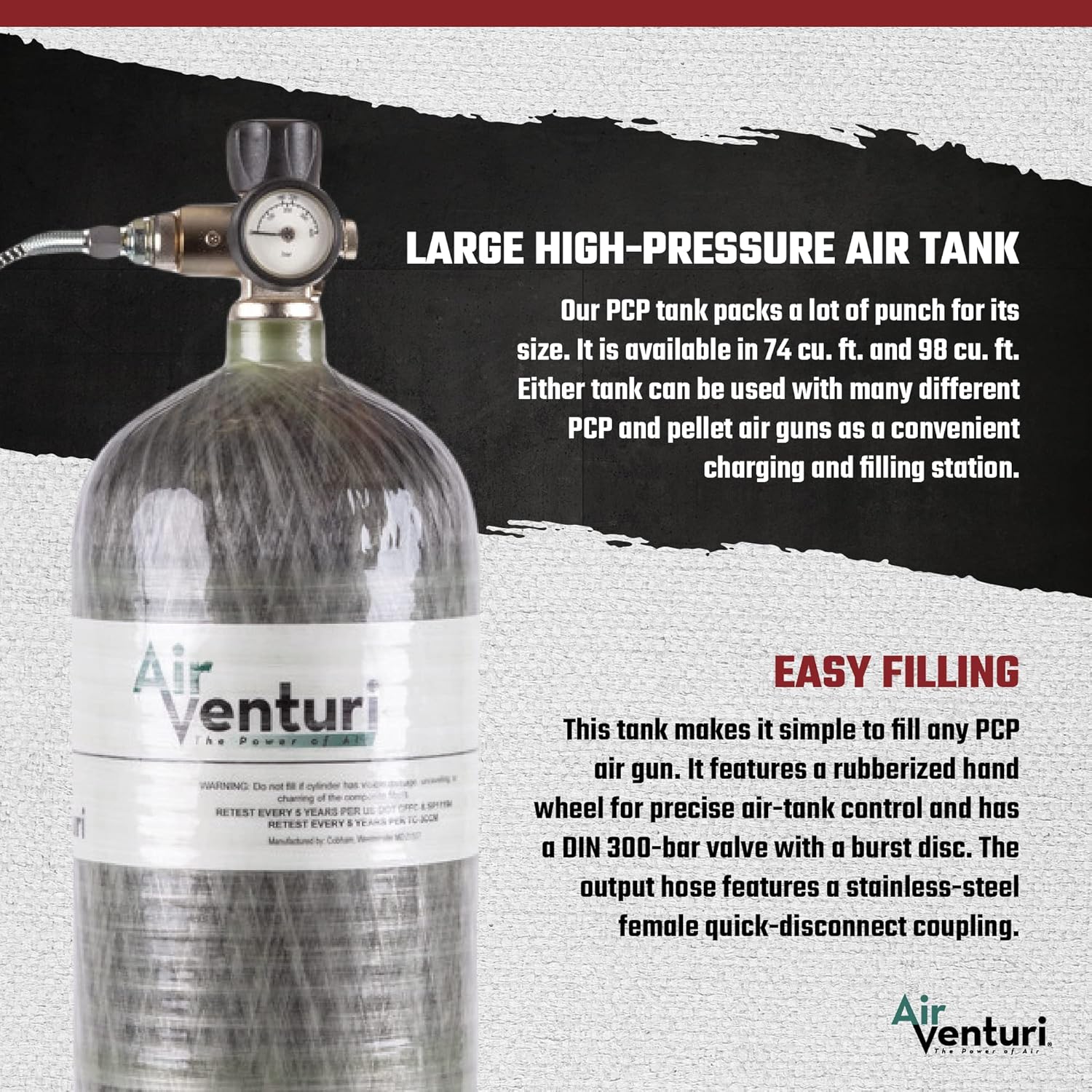 Air Venturi Carbon Fiber PCP Charging Station Assembly includes: 98 cu. ft. carbon fiber tank, 4,500 psi DIN 300 bar PCP charging station DIN 300 bar valve with burst disc Inline pressure gauge 0-6000 psi 1/8" BSPP Charging Station: 4,500 psi max pressure 24 in. microbore hose with 1/8" BSPP Male and female threaded ends, each 1/8" BSPP Stainless steel female quick-disconnect coupling attached to output end of hose Specifications: Carbon fiber filament wound over aluminum bladder 98 cu. ft. capacity 4,500 psi max pressure DOT-approved / DOT-SP 11194 13.5 lbs. dry weight 7" wide 26" tall to top of valve