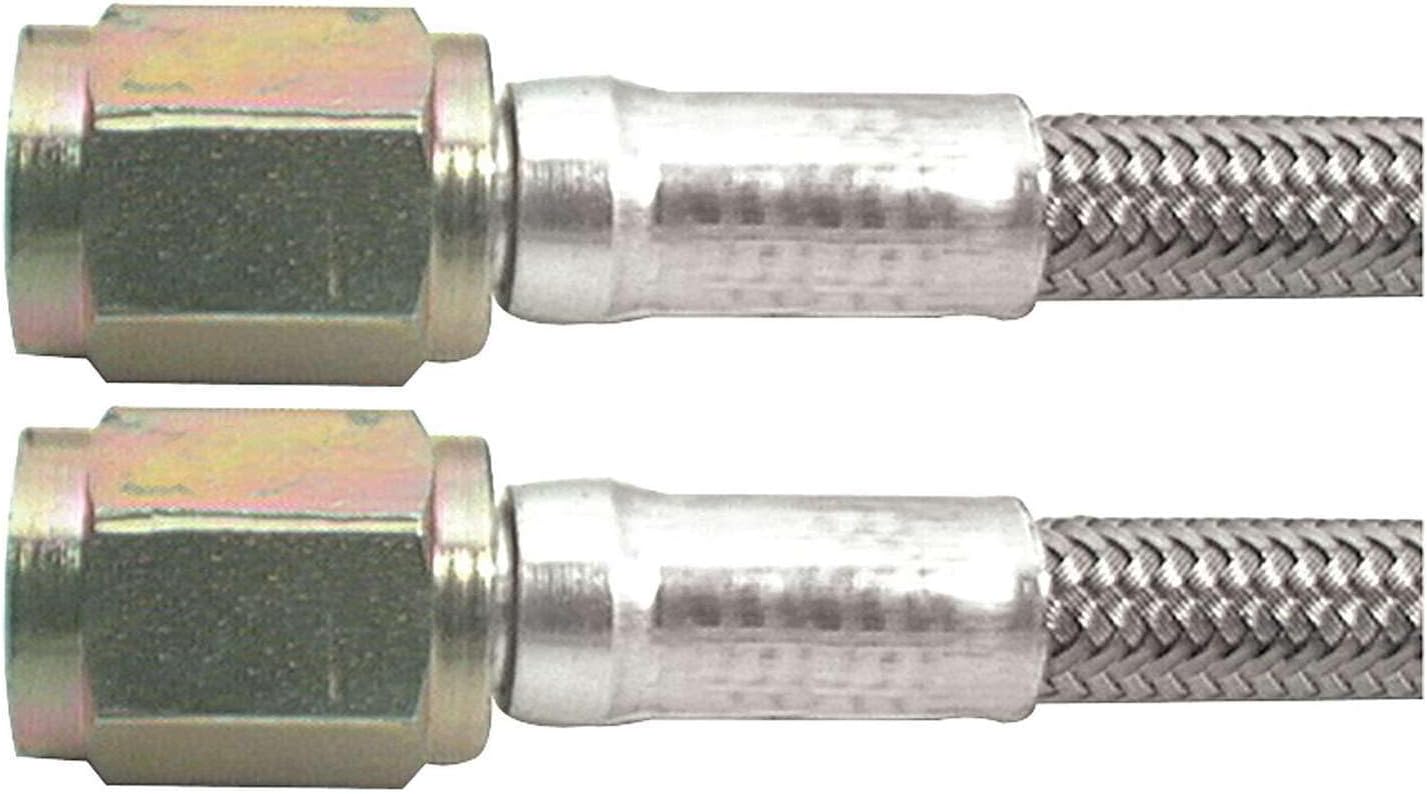 A wide selection of braided steel lines in various lengths. All lines come with one straight end and your choice of straight, 45° or 90° on the other end. The inner PTFE hose is compatible with all brake fluids. The braided stainless steel outer covering resists abrasion and corrosion. Ideal for use where bending and flexing occur. More durable than rubber hose. Lengths stated are overall end to end including fittings.