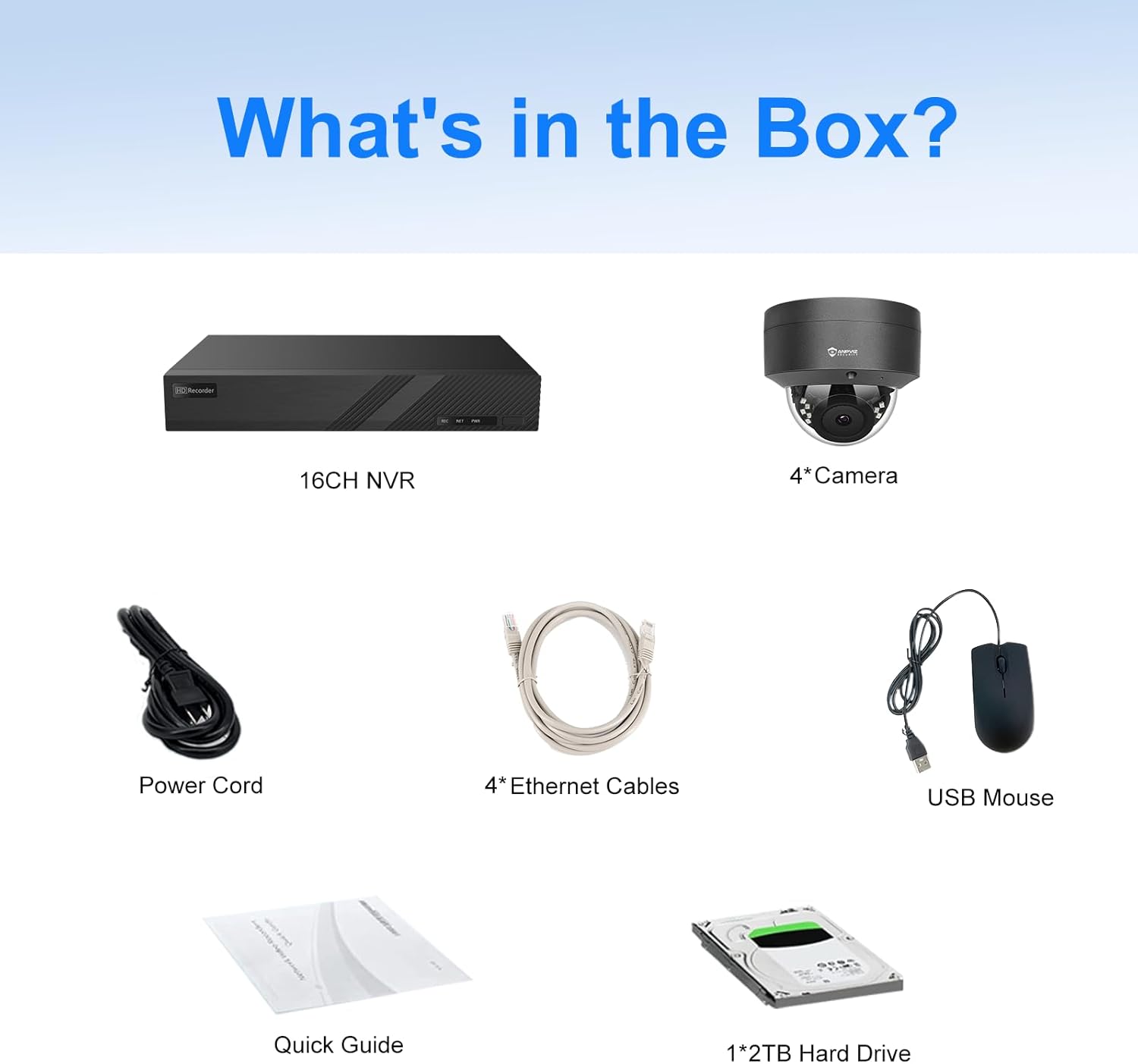 | BuiltIn Media | 1 x 8CH 4K PoE NVR (with built-in 2TB HDD), 4 x 65ft (20m) Network Cables, 4 x 6MP IP PoE Dome Cameras |