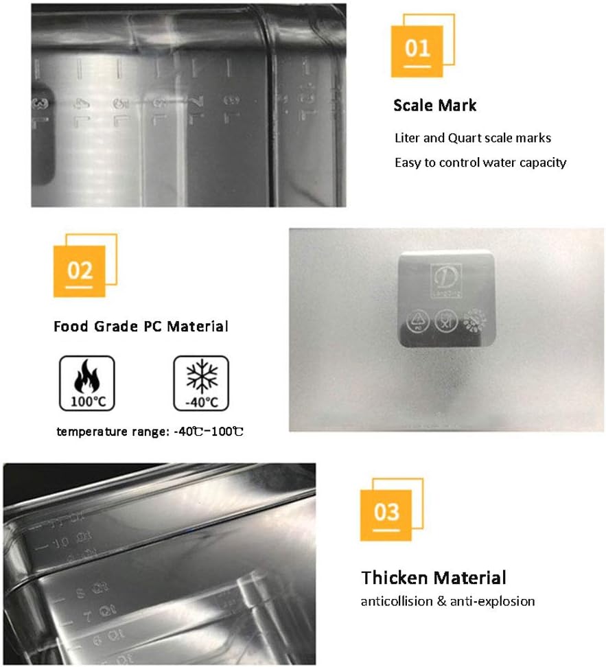 Scope of application: high-end hotels, high-end western restaurants, family kitchens, low-temperature cooking steaks, pork chops, lamb chops, fish, vegetables, etc.How to Use:Sous Vide circulator requires a 6-15L round, rectangular or other different container or pot. Firmly lock the product by clamping it on the side of your container.Sous Vide Slow Cooker low temperature slow cooker dedicated 11L water tank covered cooking stick dedicated scaled barrelTemperature range: -40 ℃ ~ 100 ℃Size: 325 × 265 × 200mmSOUS VIDE opening size: 90 × 60mmCapacity: 11 litersWith measurement (L / OT)Material: PCLFGB & FDA standardsContainer size: 325 * 265 * 200mmWeight: 1.8KGMaterial: Thicken Food Grade PC MaterialTotally dishwasher safe.polycarbonate material that withstands up to 100 ° C / 210 ° Fsous vide rack slow cooker 304 stainless steel food separation rack divider slow cooker accessoriesWeight: 0.85KGVoltage: 220V240VPower: 1800WWeight: 1.6kgPacking size: 162 * 94 * 433MMRecipes advice:Steak-132 ° F / 55.5 ° C, 6 hoursSalmon-110 ° F / 43 ° C, 30-45 minutesChicken-140 ° F / 60 ° C, 30 minutesEggs-140 ° F / 60 ° C, 10 minutes